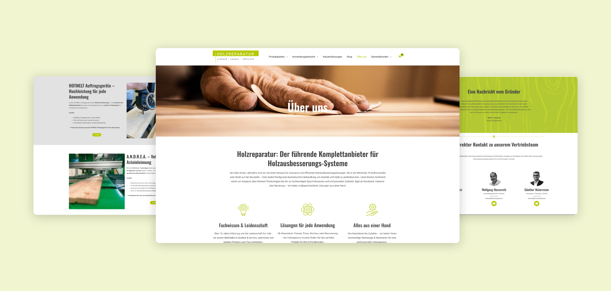 Ein übersichtlicher Einstieg mit Vorstellung des Unternehmens, Highlights der angebotenen Holzreparatur-Leistungen und direktem Zugang zu den Servicebereichen. Die Startseite ist so gestaltet, dass sie sowohl Besucher:innen als auch Suchmaschinen anspricht.